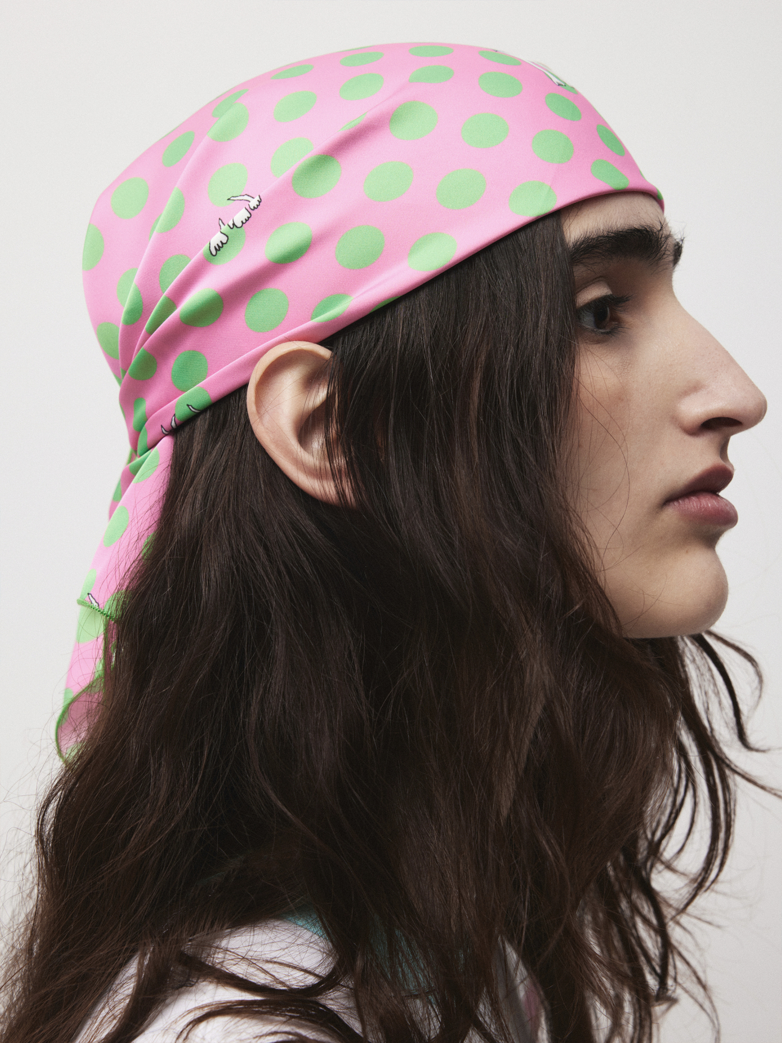 BANDANA IN FAKE SILK. DOG AND POLKA DOT PATTERN. 65 CM x 65 CM.