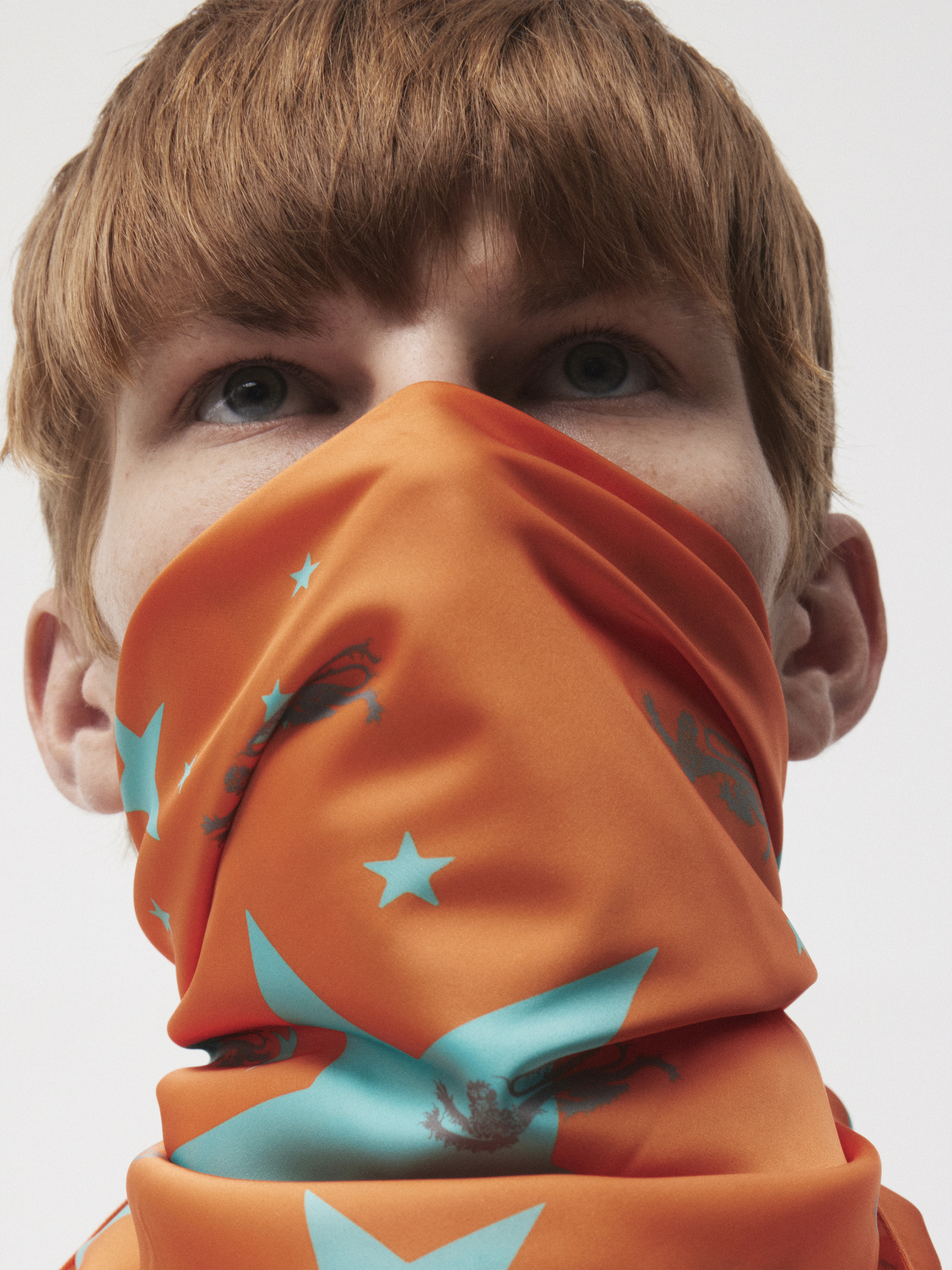 BANDANA IN FAKE SILK. LIONS AND STARS PATTERN. 65 CM x 65 CM.