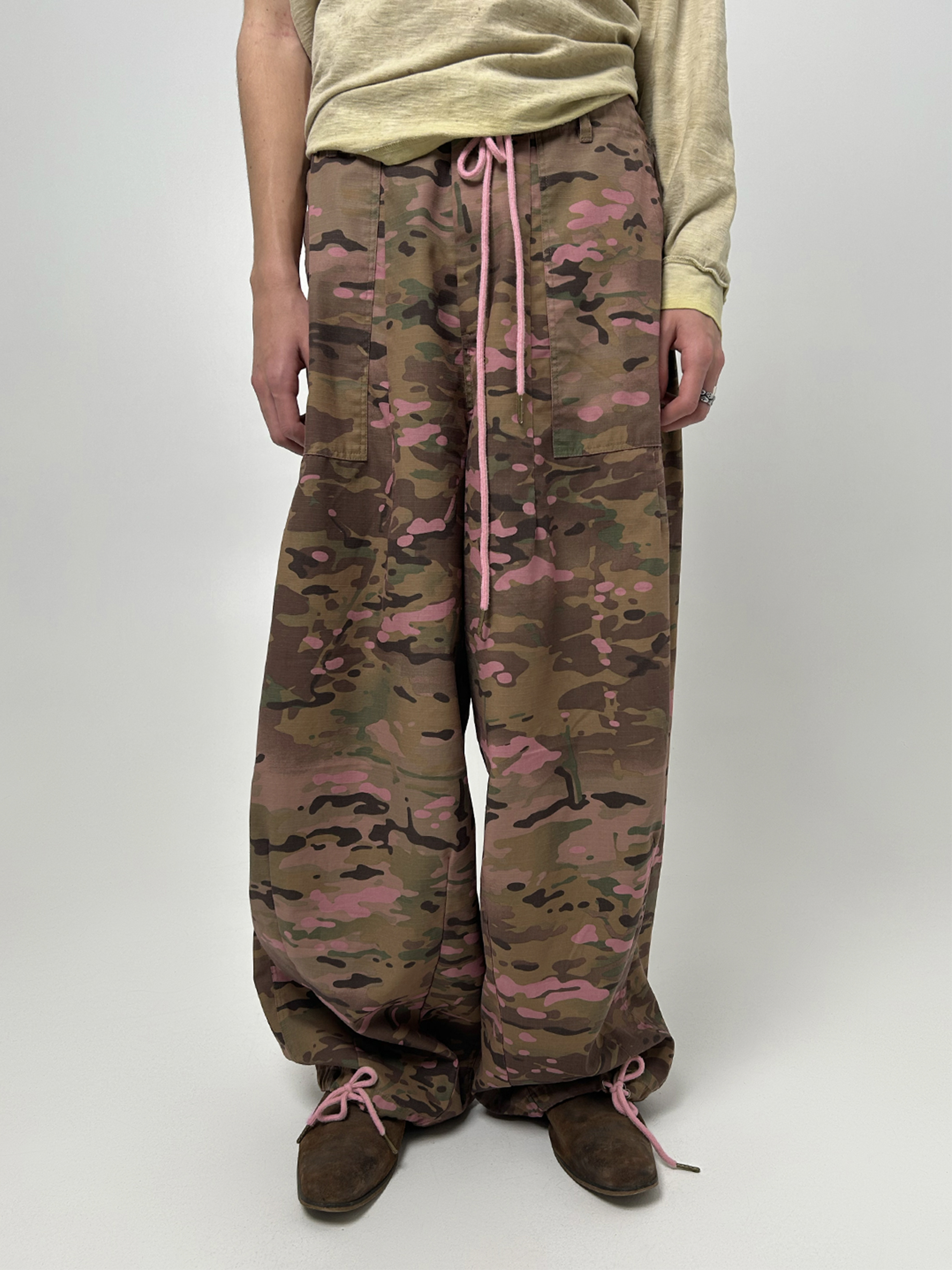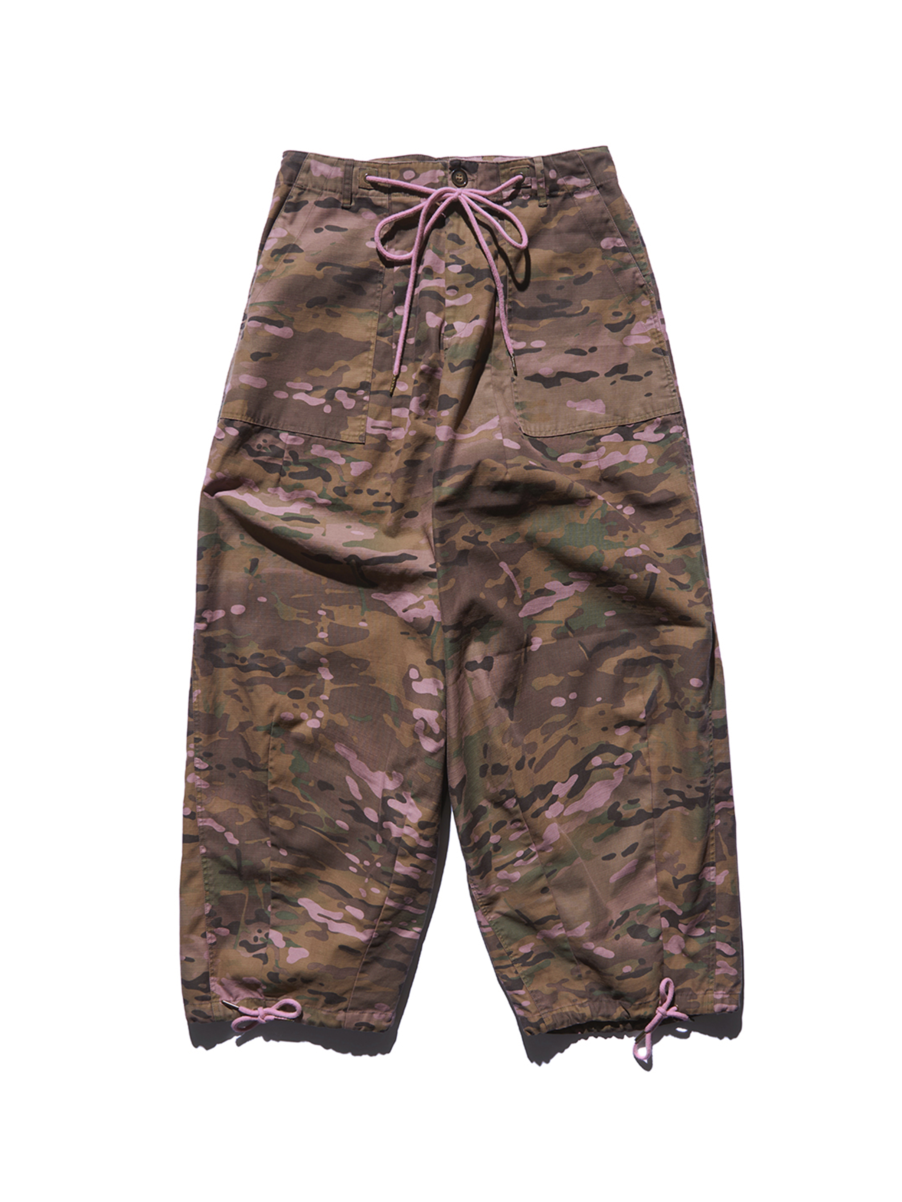 THE MONK'S TROUSERS ARE MADE FROM INDIAN VINTAGE WASHED MULTICAM RIPSTOP. OVERDYED IN PINK. DRAWSTRINGS ON THE SIDE SEAMS. LACES ON WAIST AND LEGS. YKK HARDWARE. TWO ADDITIONAL POCKETS WITH BUTTONS AT THE BACK.
